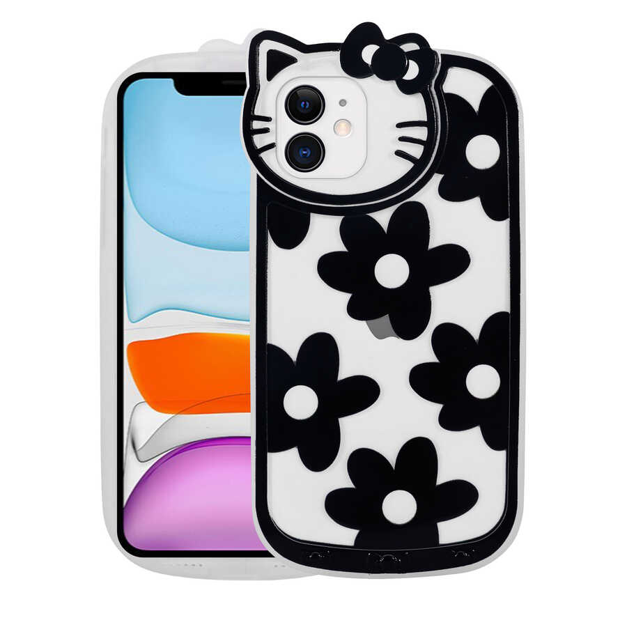 Apple iPhone 11 Kılıf Kedi Figürlü Transparan Sert Silikon Zore Kity Kapak Siyah Çiçek