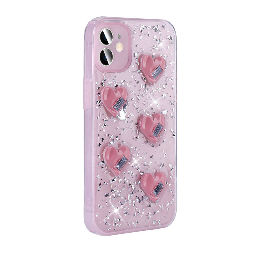 Kalp, yıldız ve fiyonk şekilleriyle birlikte simli tasarım, parıltılı şık arka yüzey yapısı.