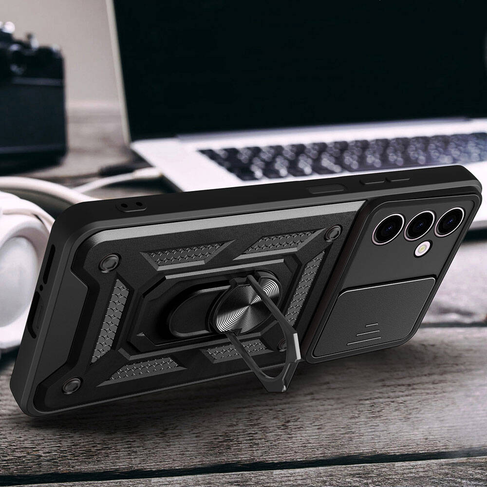Galaxy A24 Kılıf Magnetik Standlı Kamera Korumalı Zore Sürgülü Vega Kapak Siyah