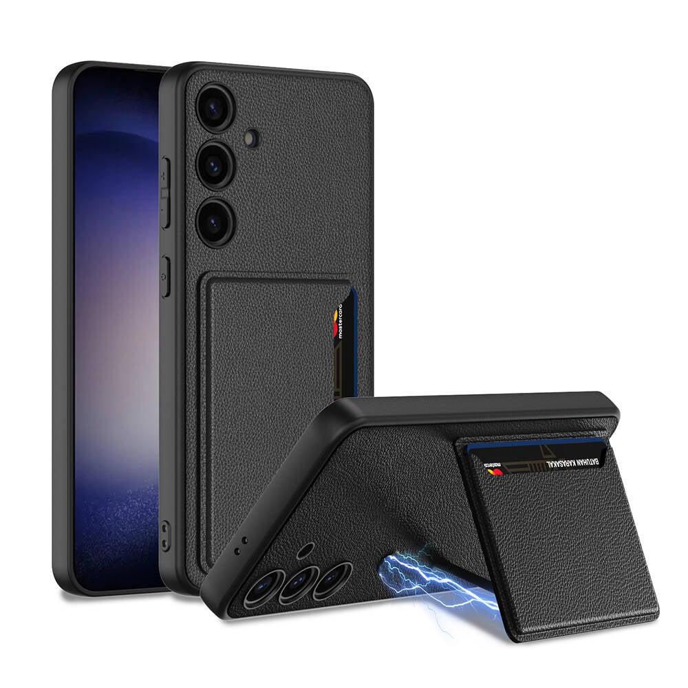 Galaxy S24 Suni Deri Arka Yüzey Zore Kartlıklı Kıpta Silikon Kapak Siyah