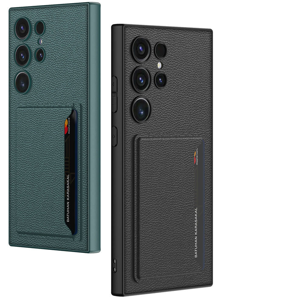 Galaxy S24 Ultra Suni Deri Arka Yüzey Zore Kartlıklı Kıpta Silikon Kapak Siyah Karbon