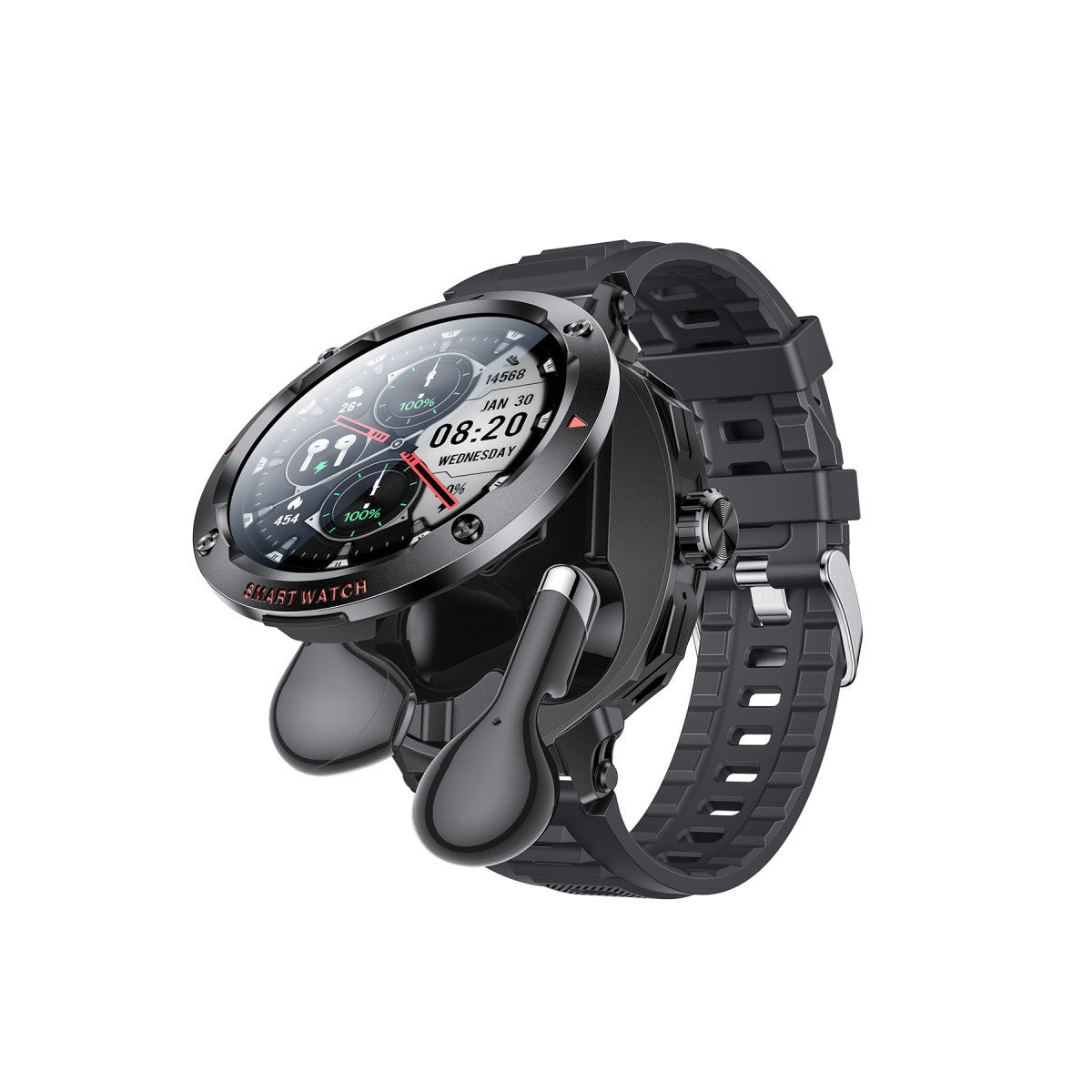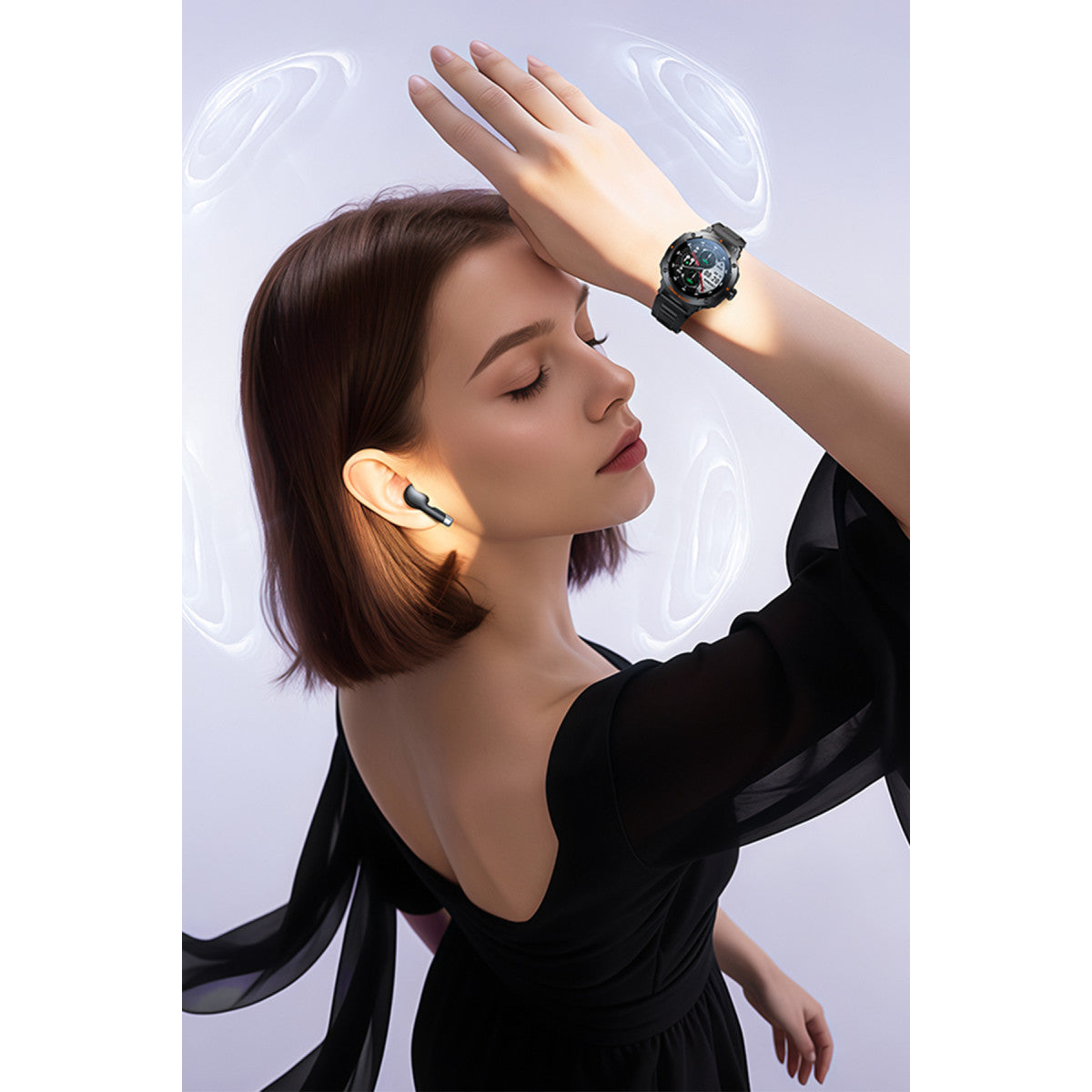 Saat ve kulaklık bir arada tasarımıyla hem fonksiyonel hem de taşınabilir kullanım sunar.